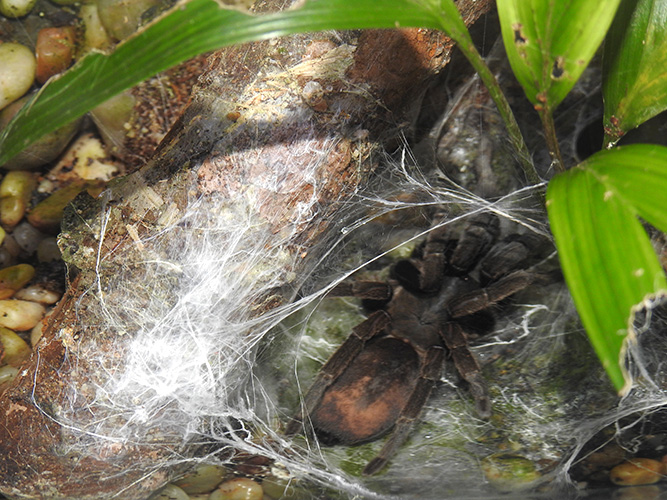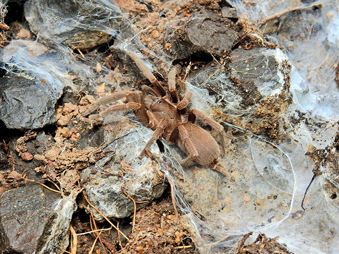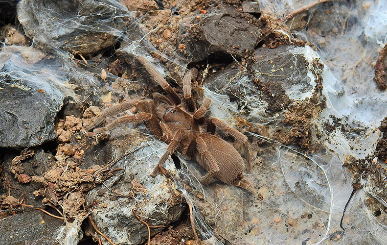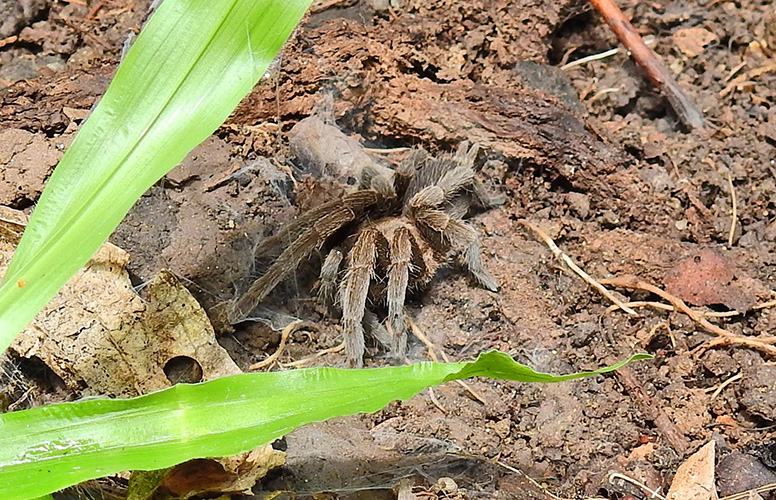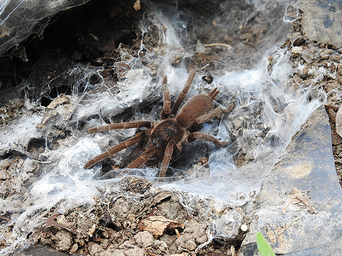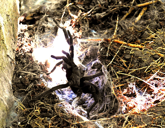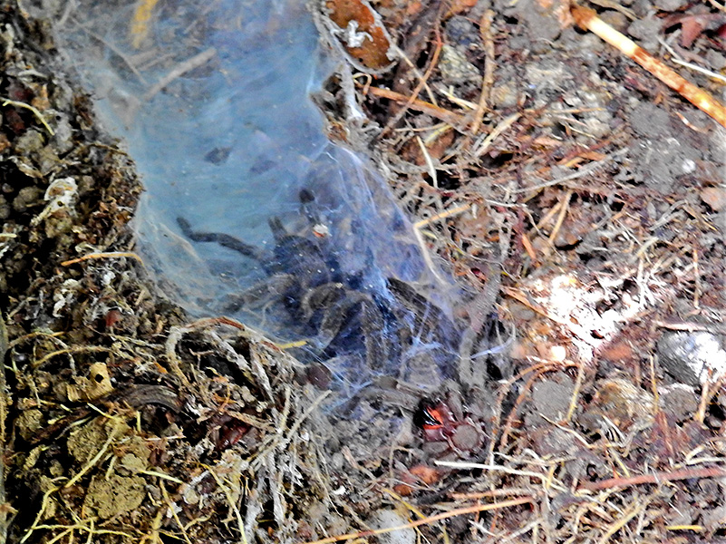 They live in deep, silk‑lined burrows, often concealed beneath leaf litter or at the base of trees. These burrows protect them from heat, predators, and dehydration.