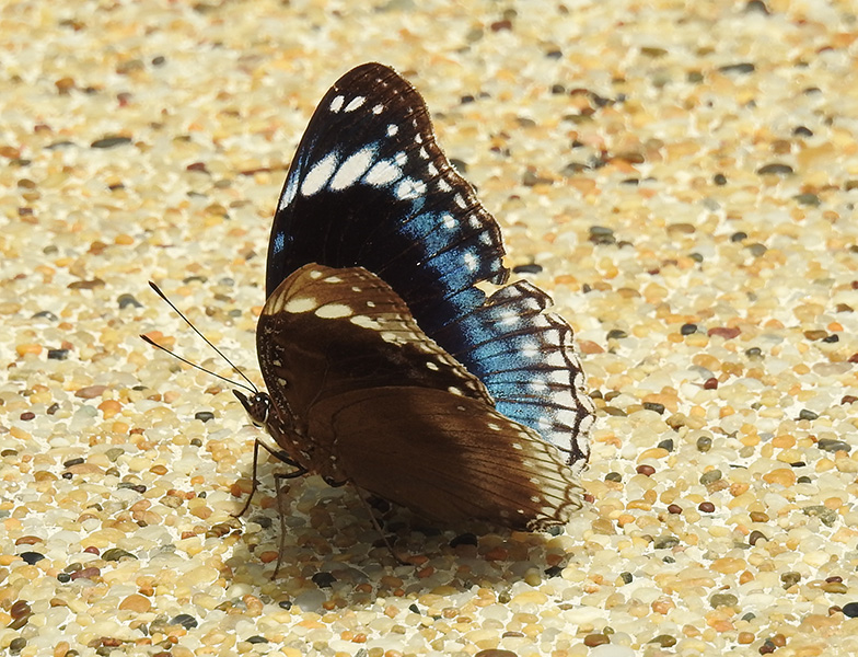 The Blue-banded Eggfly has a confident, gliding flight with occasional quick wingbeats. Males are particularly active and may patrol small territories in search of females.