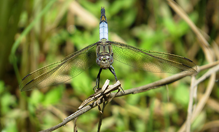 In some species, the blue is actually a dusty, waxy coating called pruinescence that develops as the dragonfly matures.
