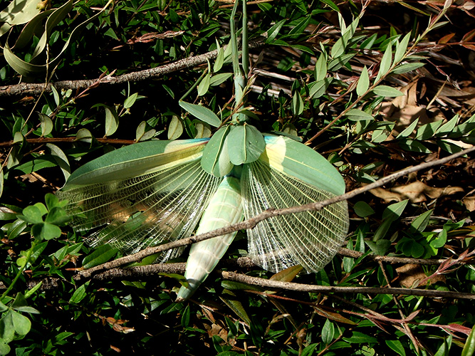 When disturbed, it performs one of Australia’s most striking insect defence displays. It may raise and flap its wings to expose the bright blue patches, strike its hind legs together, and vibrate surrounding leaves. This sudden movement and colour display is designed to startle predators, such as birds or reptiles, giving the insect time to escape..