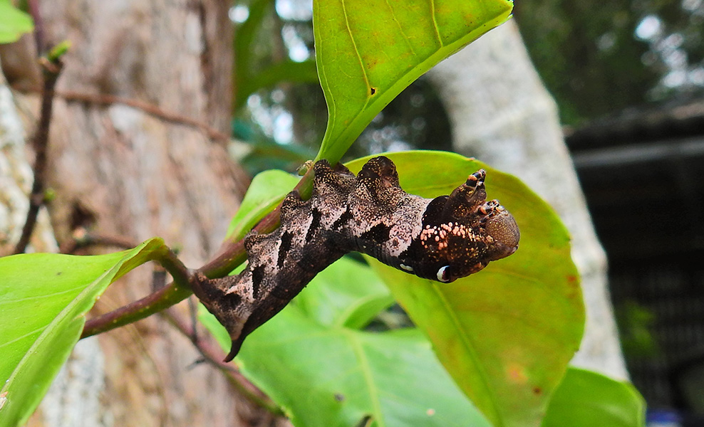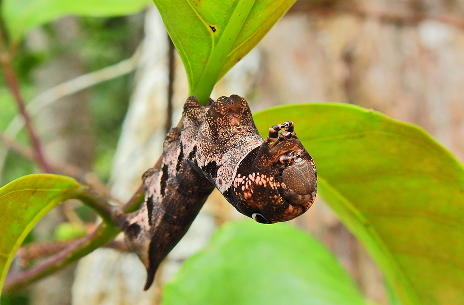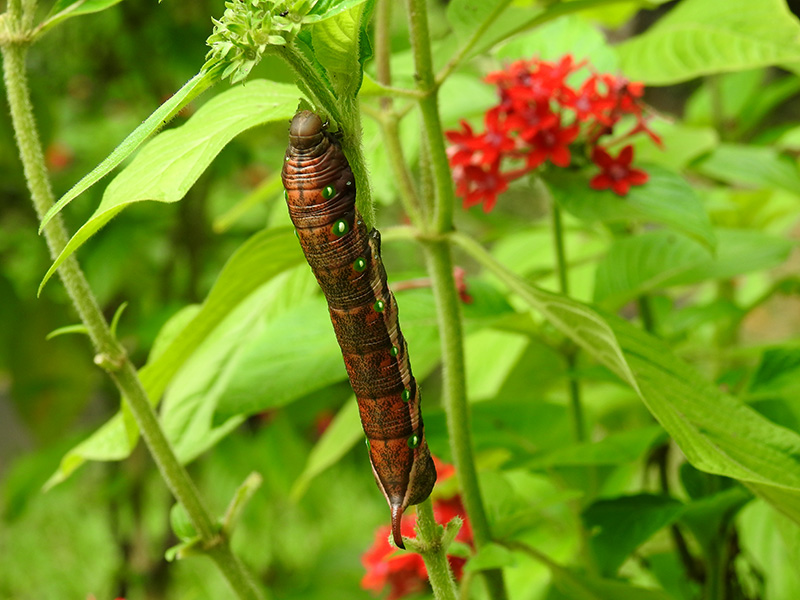 Hawk moth caterpillars are often large and distinctive. They are commonly called hornworms because many species have a curved horn at the rear of their body.
