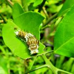 - The Stink Horn: Like all swallowtail caterpillars, the Orchard Swallowtail possesses a hidden, chemical weapon. Tucked just behind its head is a bright reddish-orange, forked, fleshy organ called an osmeterium. If a bird or a curious gardener startles the caterpillar, it instantly shoots this bright organ out, releasing a pungent, foul-smelling chemical that smells like a mix of rotting citrus and rancid butter to drive the predator away!