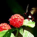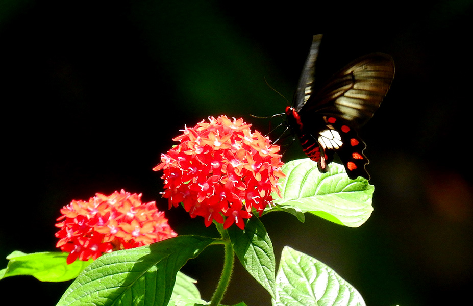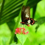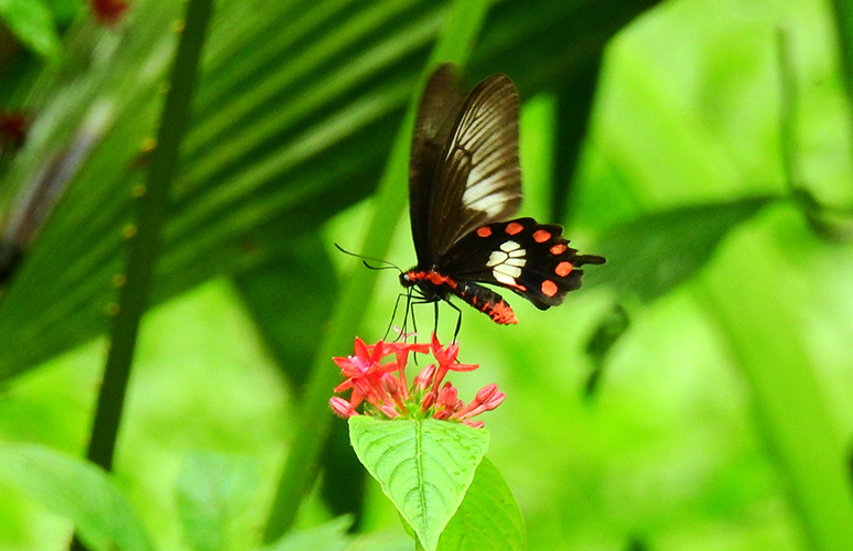 Adult Red‑bodied Swallowtails feed on flower nectar, visiting a variety of blossoms in the rainforest and surrounding vegetation.