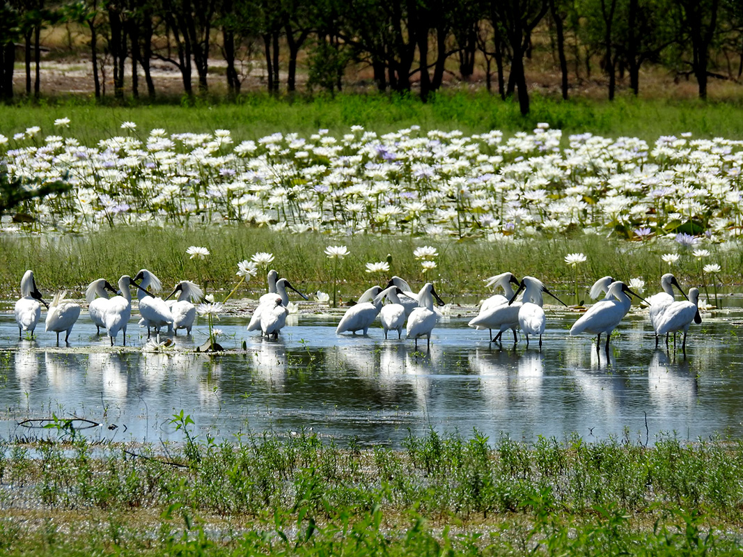 Imagine standing quietly by a reed-fringed billabong. You will see the Spoonbill wading slowly forward through shallow water. It lowers its open bill and sweeps it rhythmically from side to side in wide arcs.