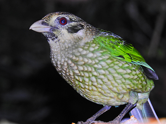 The Spotted Catbird is a medium-sized bird, adorned with a vibrant green plumage that allows it to blend effortlessly into the leafy rainforest canopy. Its upperparts are a rich, emerald green, while its underparts are lighter and speckled with white spots, resembling dappled sunlight filtering through the trees. The bird’s eyes are a deep, striking red, providing a sharp contrast to its green feathers.