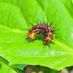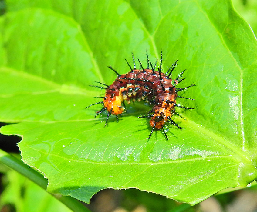 - Caterpillar: bright orange with black spines